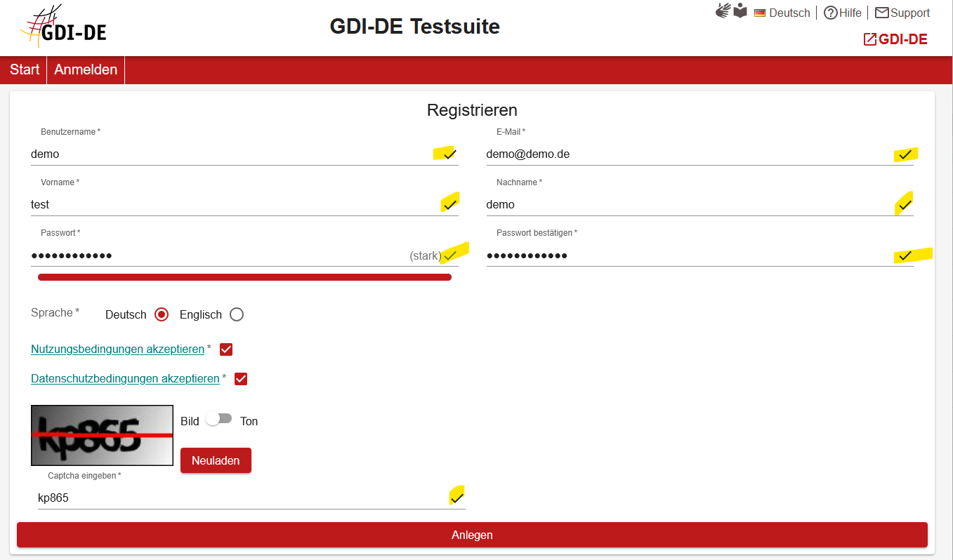 Falls Probleme bei dem Versuch einer erstmaligen Registrierung bei der GDI-DE Testsuite auftreten, sollten zunächst die folgenden Punkte überprüft werden: